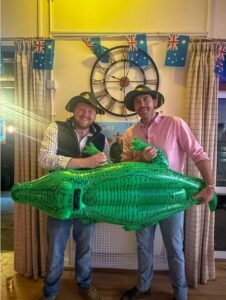 Fellow farmer and social media personality Ioan Humphreys, known as “That Welsh Farmer,” shared a photo from the event. In the snap, both men grin while holding inflatable crocodiles and wearing classic Aussie outback hats, with Australian flags hanging in the background.